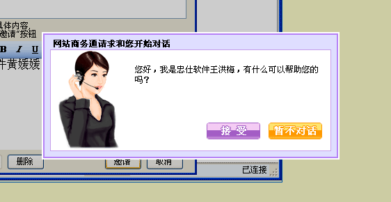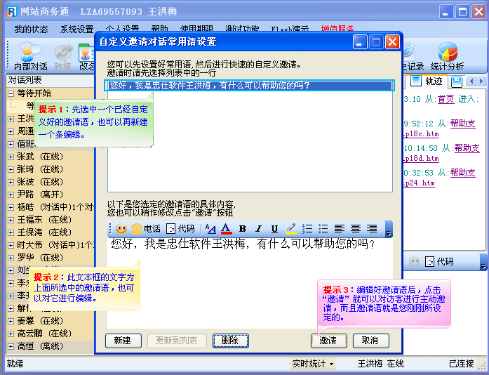 “设置常用邀请语”可以让您以最简洁最友好的问候邀请在线访客,无需您每次重复输入邀请语,在最短的时间建立与访客之间的友好交流。