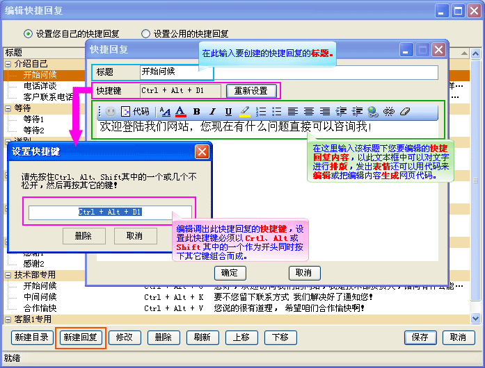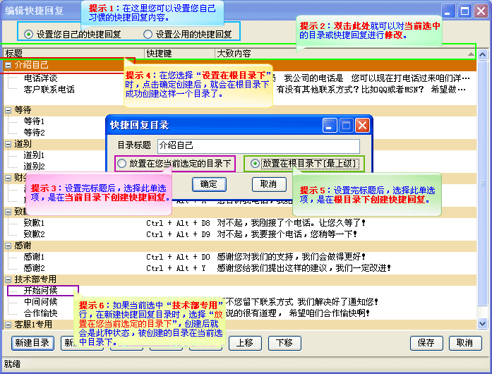 打开编辑快捷回复对话窗口,新建快捷回复目录,如(图2);