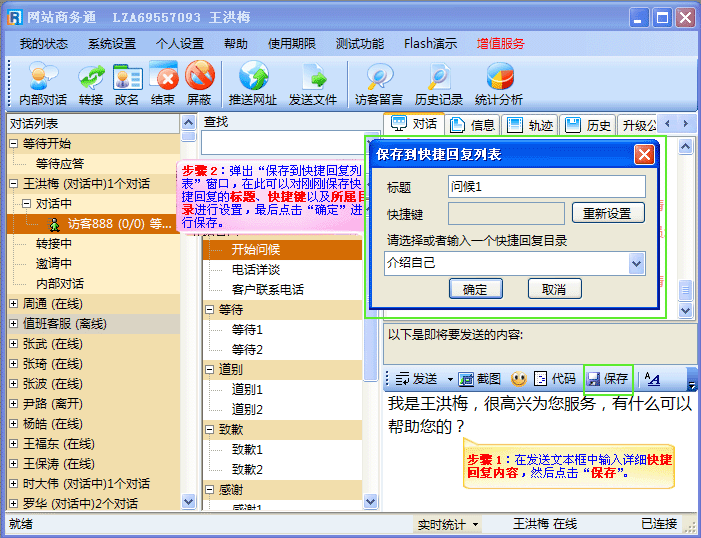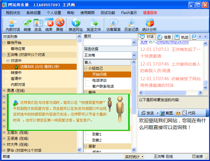 可以让您的访客刚打开对话窗口时就可以迅速的看到您第一时间发出的的问候语,对于客户经常询问的问题可以设置成快捷回复,待客户再有此问题发出后就可以双击之前设置的快捷回复或使用相应快捷键,进行发送。