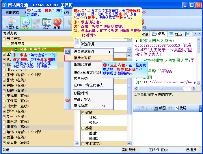 当有新的访客主动请求对话时,请按以下步骤进行操作 ,如(图2);