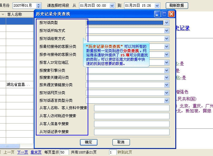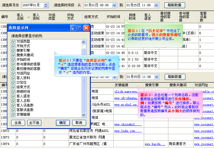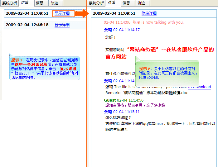 会对每一位访问您网站的访客做一个详细的数据备份,从它自身的一系列资料到对话及其在您网站上所做的任何操作情况都为您在数据库中做以备案,并且可以随时在“