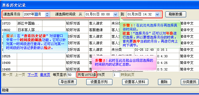 都会自动对在这段时间段内产生的对话做一个统计,最终显示在“查看历史记录”对话窗口的下方,如(图7);