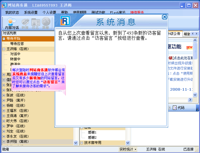 登陆后在打开软件界面的同时系统会自动弹出一个系统消息提示窗口提醒有多少条访客留言,如(图4)
