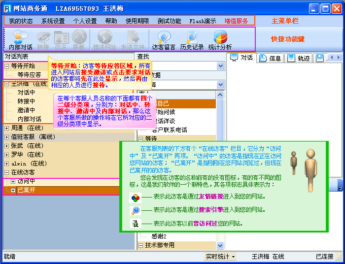 - 首先登录网站商务通(LR)软件,我们看软件的主要界面功能,粉色框内的是主菜单栏,它是软件的主要功能设置区域,大部分的功能都可以在主菜单栏中找到,在主菜单栏的下面是快捷功能按钮,它可以在您对访客进行操作时,让您可以快捷方便地找到对您想要做的一些操作,“对话列表”项为软件界面的核心部分,在此可以清楚的查看到后台的在线客服,及访客的浏览情况,如(图1);