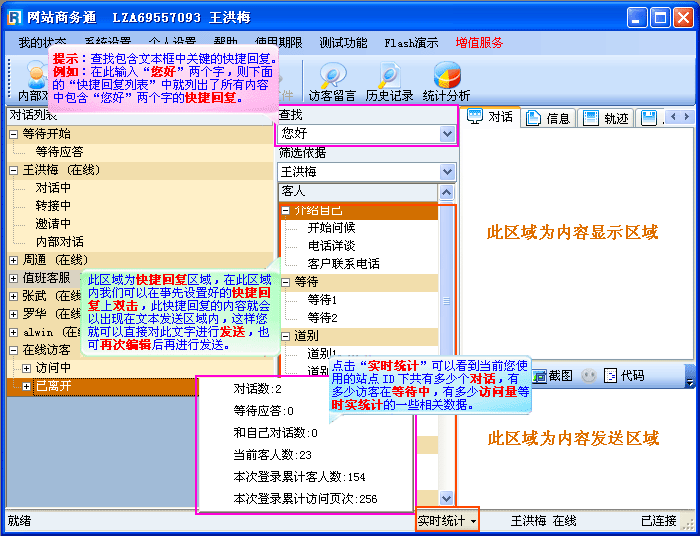 - 中间这一区域为“快捷回复区域”,此区域可将对话过程中反复出现的语言设置为快捷回复,然后在快捷回复列表中双击您要发送的快捷回复语,它就会出现在您的发送区域中,“查找”功能指在快捷回复内容中按您在查找框内输入的关键词进行查找,所有包括此关键词的快捷回复都将显示在下面的“快捷回复列表”中,在主界面的最右侧分为两个区域,上面的是“内容显示区”,下面的是“内容发送区域”,在软件界面的最下方可以看到当前站点下的一些实时统计数据以及当前操作员的当前状态,如(图2)
