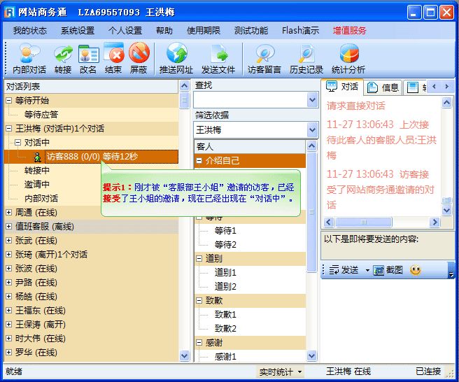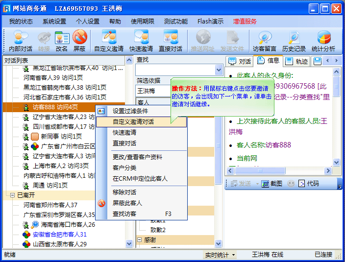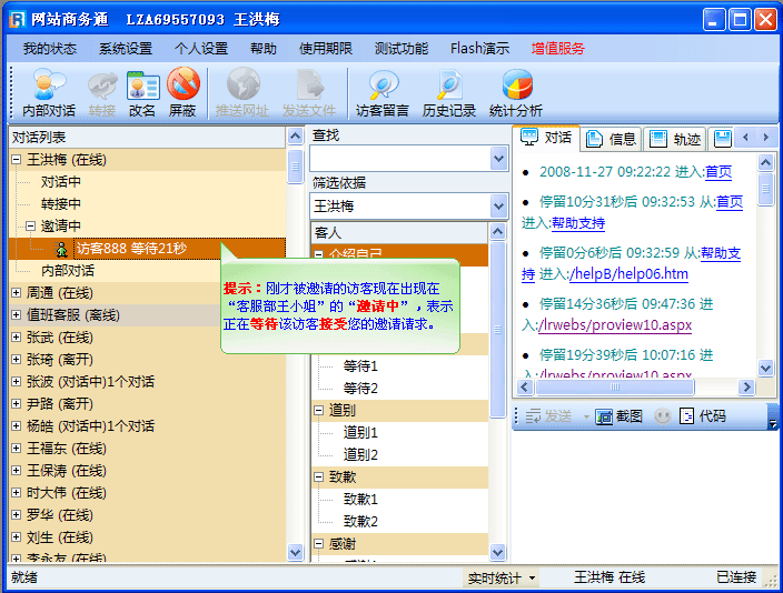 - 此时,客服端软件中“访客888”会由“邀请中”转为“对话中”来,如(图7)