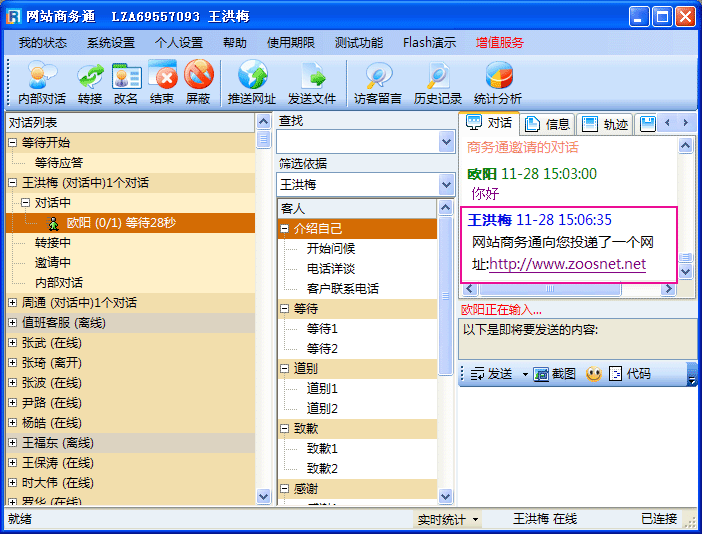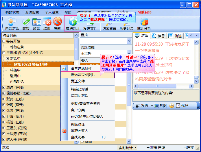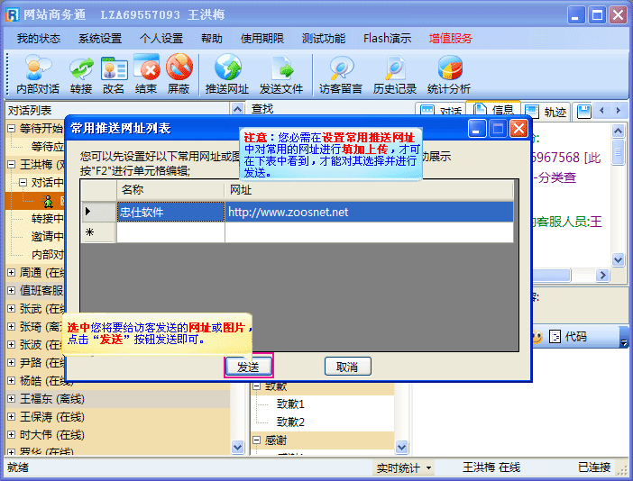 必须先在“设置常用推送网址”中设置常用推送网址,才可以在访客名称右键中对访客进行发送。