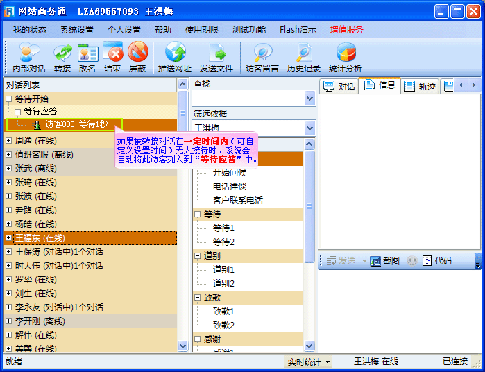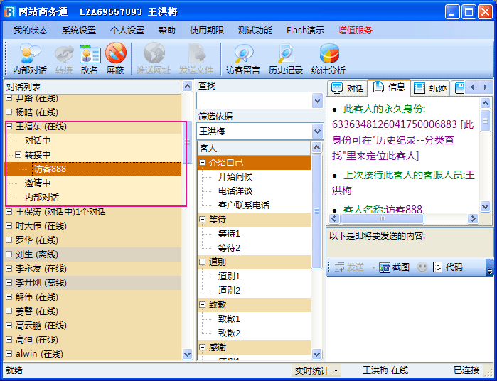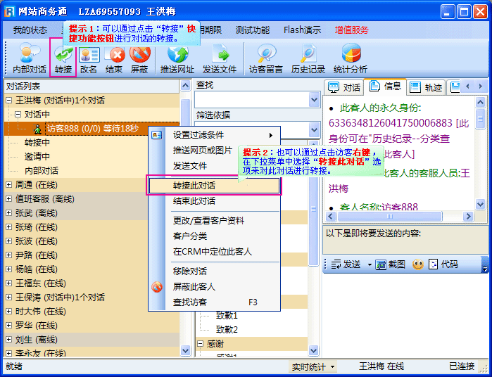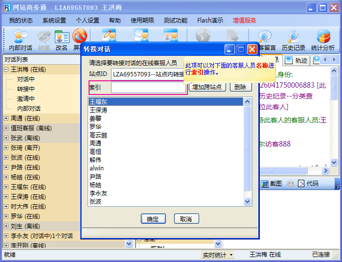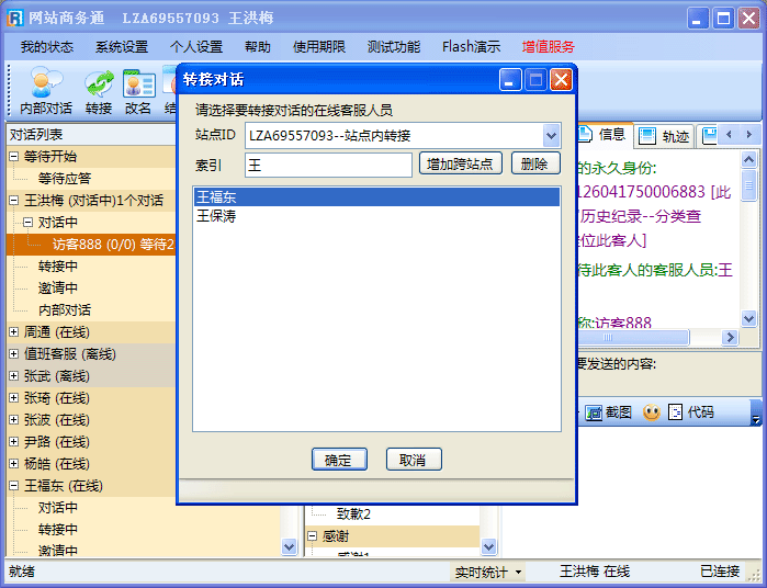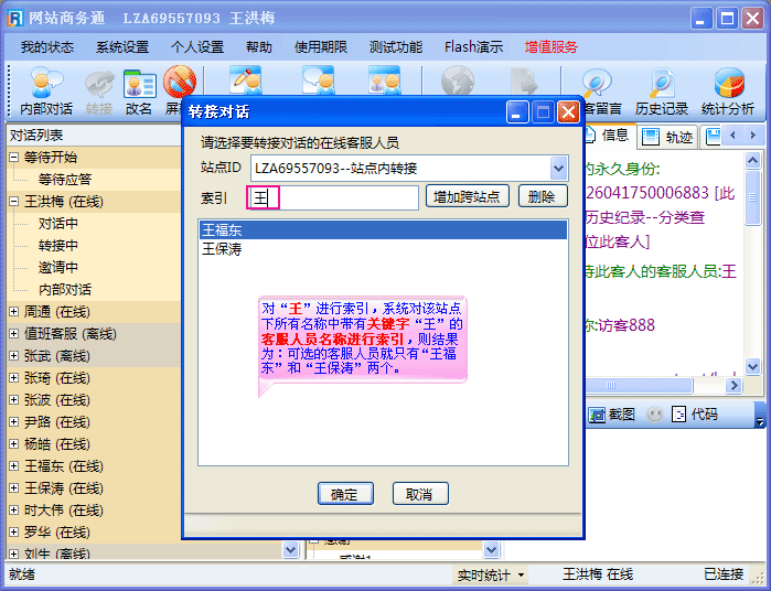 - 如果您正在接待的客人不是想找您,而是想找其它的某一位客服人员时,就可以把此访客转接给其它目标客服。