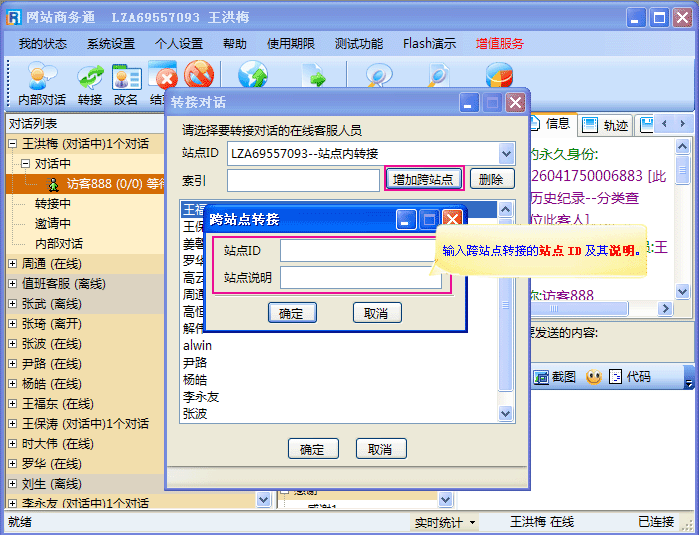 - 在“转接对话”的对话窗口中可以在站点内转接,也可以跨点转接,需要跨点转接时点击“增加跨点转接”后增加站点即可,如(图2);