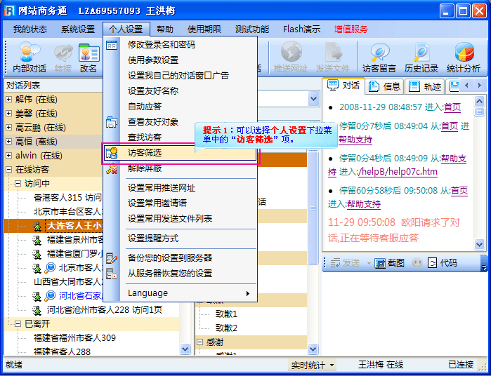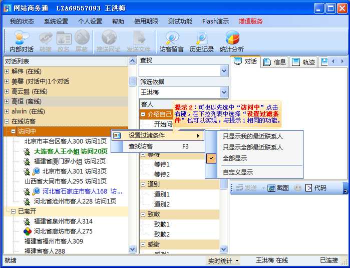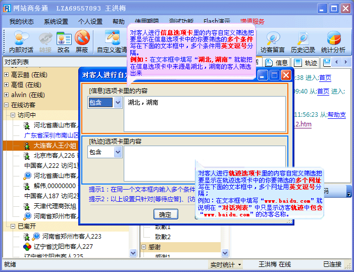 您可以根据您的业务范围来对访客的来源进行筛选,此项功能有利于公司的宏观调控及有序运作,可以成倍的提高客服人员的工作效率 。
