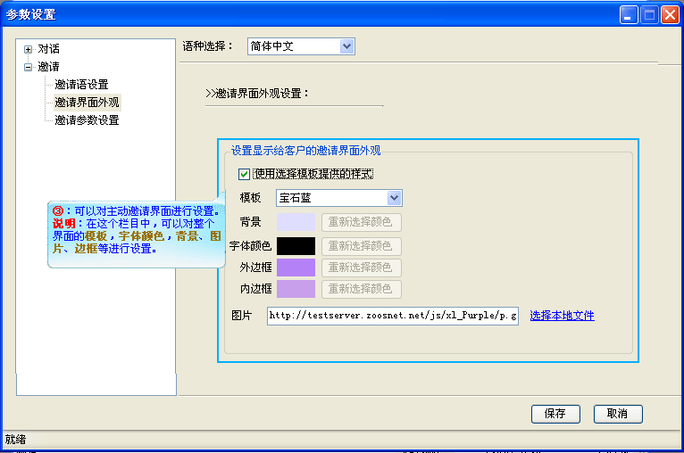 打开参数设置对话窗口,选中邀请下的邀请界面外观设置,对主动邀请的样式进行自定义设置,如(图3);