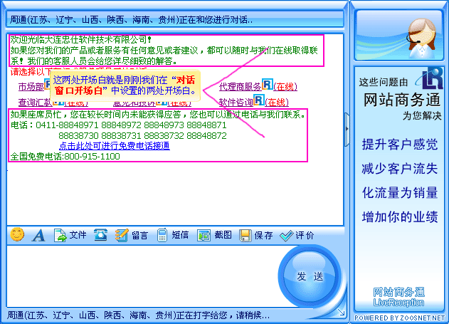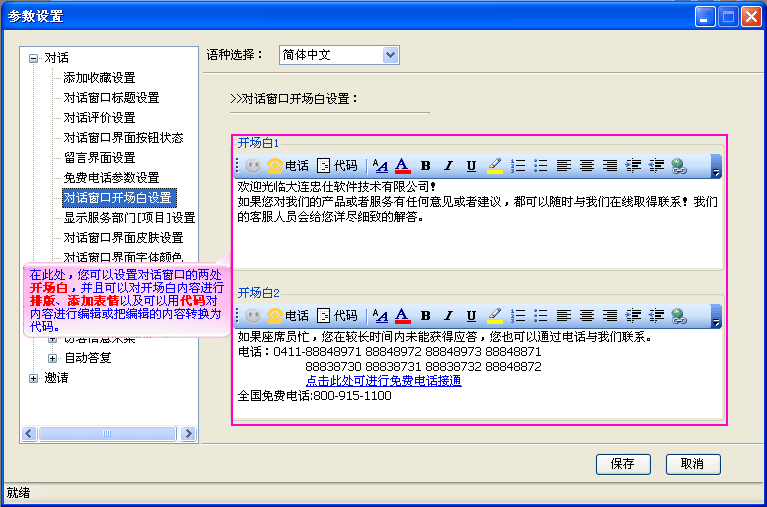 能够让访客在对话开始之前就已经了解到您公司的业务情况、服务时间,或联系电话等等一些情况,您可以把您想让访客第一时间了解到的事物编辑到自定义开场白中。