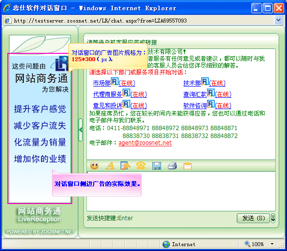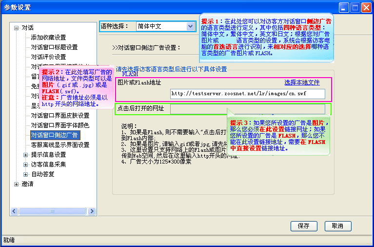 打开设置窗口,选择“对话”下面的“对话窗口侧边广告”,对其设置如下提示,如(图2);