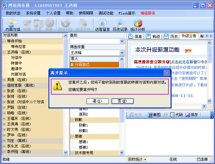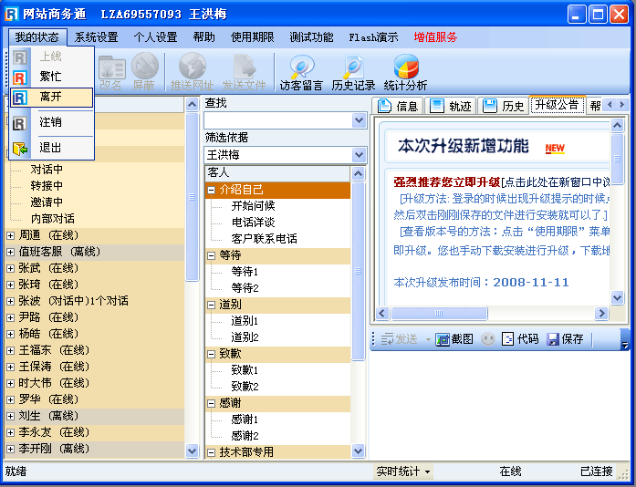 “离开”状态并不是指退出本软件,它是为客服人员可能因为一些事情要暂时离开操作位置时而设定的一种状态形式。