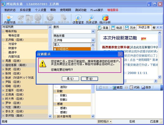 “注销”功能用于您对软件进行了一些特殊系统设置(如“更改个人权限、登陆名、密码等”),需要对软件进行注销再重新上线后才能生效。
