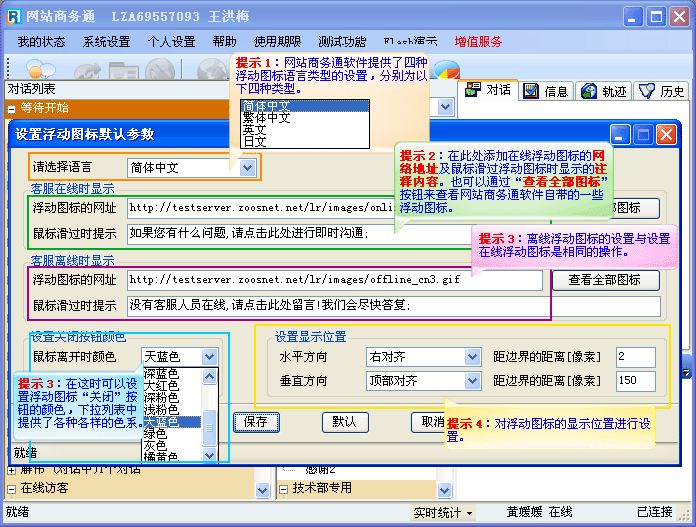 设置浮动图标默认参数窗口的各项设置,其中浮动图标也可以使用自己制作的图片,只需把图片上传到网络空间上,再把网址填写在对应的填写框内即可,如(图2);