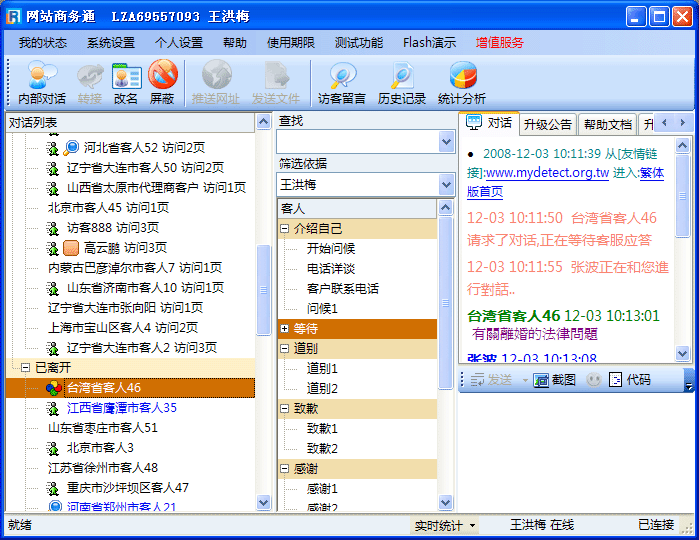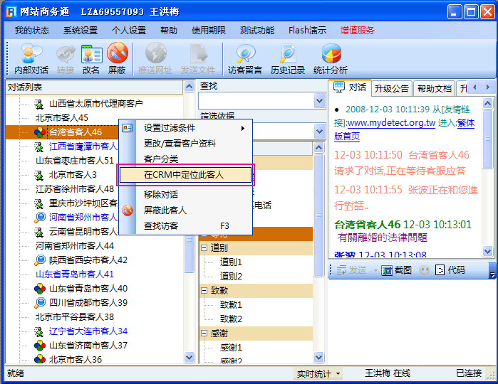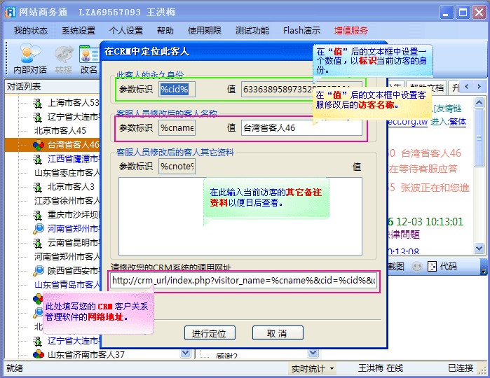 - CRM定位功能的定位原理:通过您的CRM软件网址使网站商务通软件与您的CRM软件之前进行物理连接,这样您就不必同时打开两个软件,在网站商务通的“在CRM中定位此客人”操作窗口中就可以根据设定的关键词对您的CRM软件数据库进行查找,然后调出符合条件访客的相关资料。在此功能的协助下,您可以方便快捷的查找到所需访客的资料。