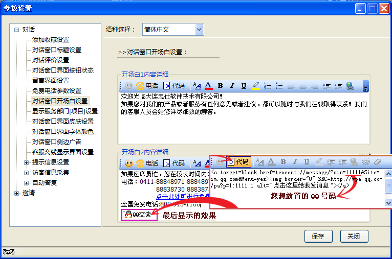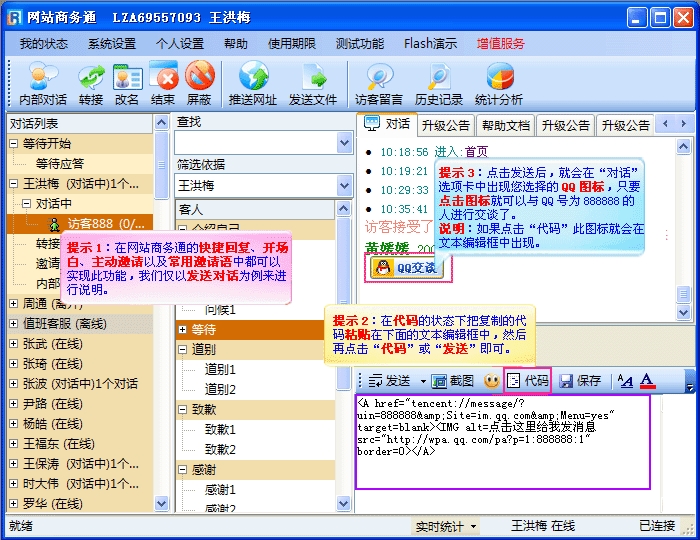 - 在网站商务通的文本编辑框中,常带有一个“代码”功能,它可以实现QQ及MSN等通讯工具的及时互动对话功能,可以使您不用打开QQ或MSN就可以随时让别人找到您,或您可以随时打开与别人对话窗口与其进行对话。