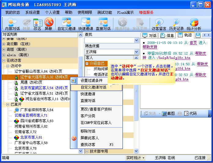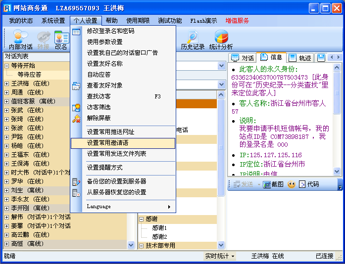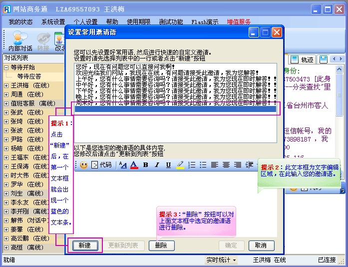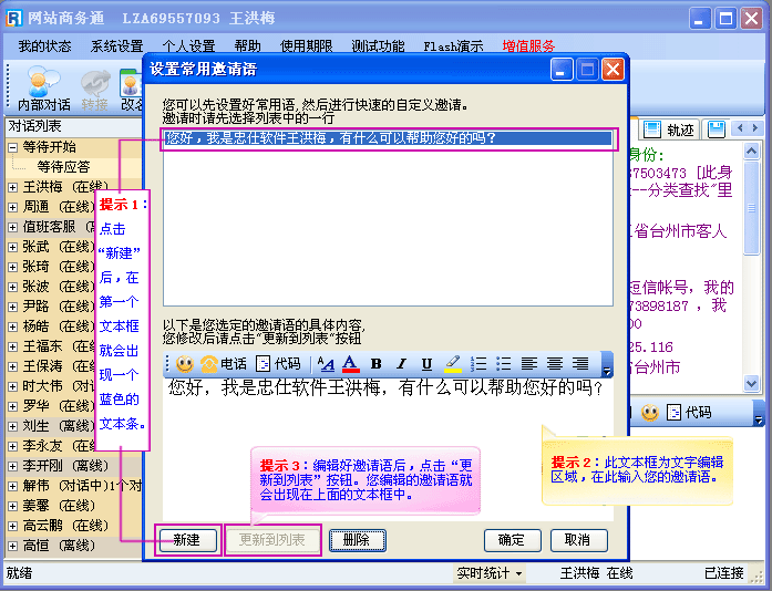 “设置常用邀请语”可以让您以最简洁最友好的问候邀请在线访客,无需您每次重复输入邀请语,在最短的时间建立与访客之间的友好交流。