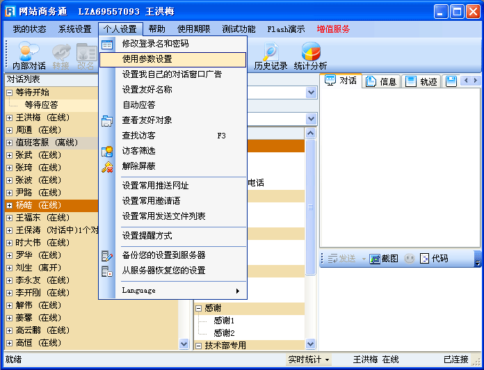 - 登录网站商务通(LR)软件,点击”个人设置“菜单项,如(图1);