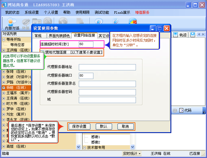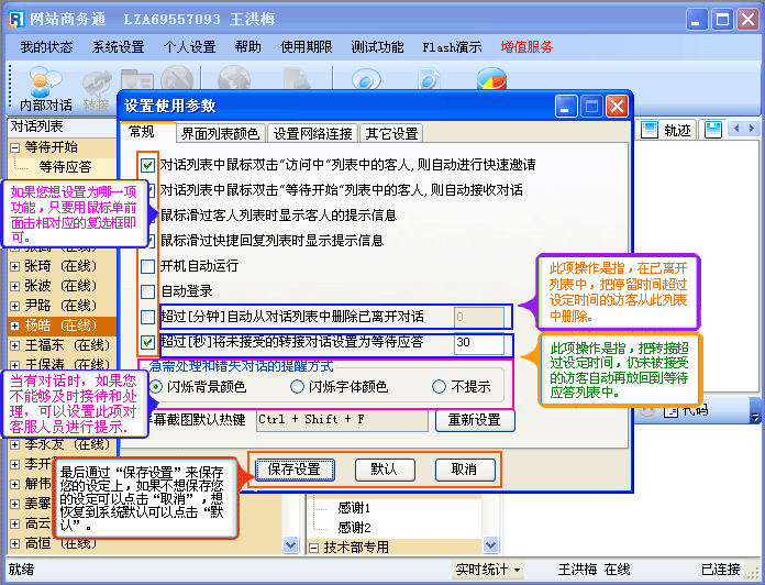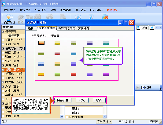 - “个人设置--设置使用参数-界面列表颜色”的设置,填写完后,点击”确定“,这样就完成了您所设置的新的登陆名和密码,当您再次登陆网站商务通(LR)软件时必须输入您新设定的内容进行登陆。