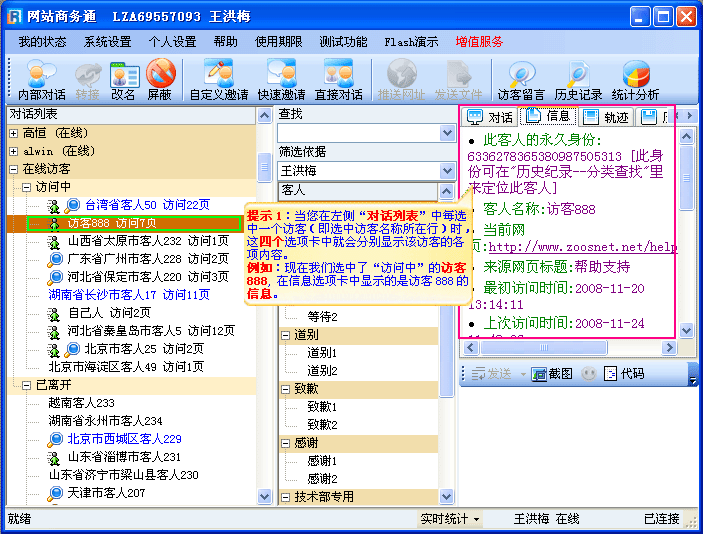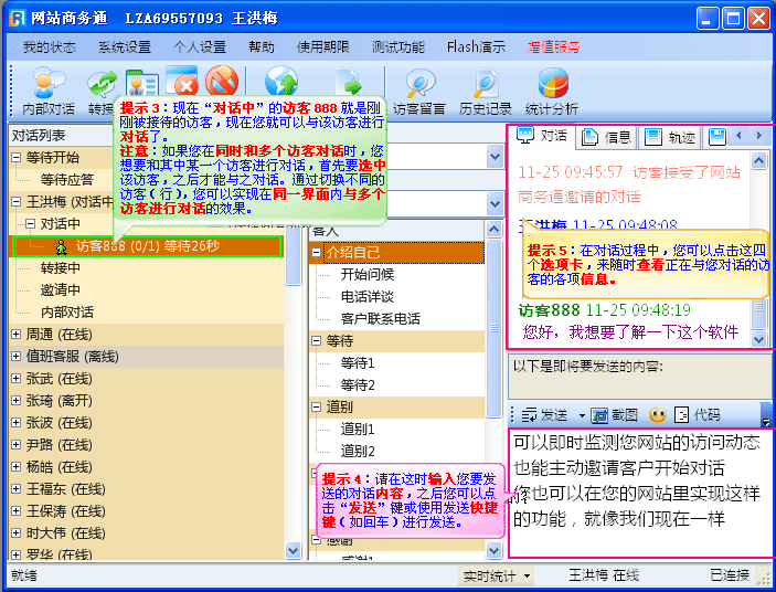 接待访客是网站商务通软件的基本功能之一,它的操作非常简单,您看完以下说明就会完全明了。