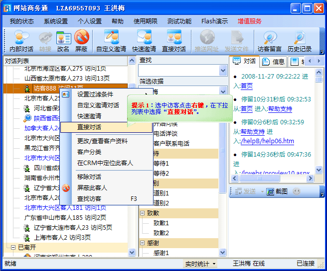 软件,选中“访客中”的访客点击右键选择“直接对话”,如(图1);