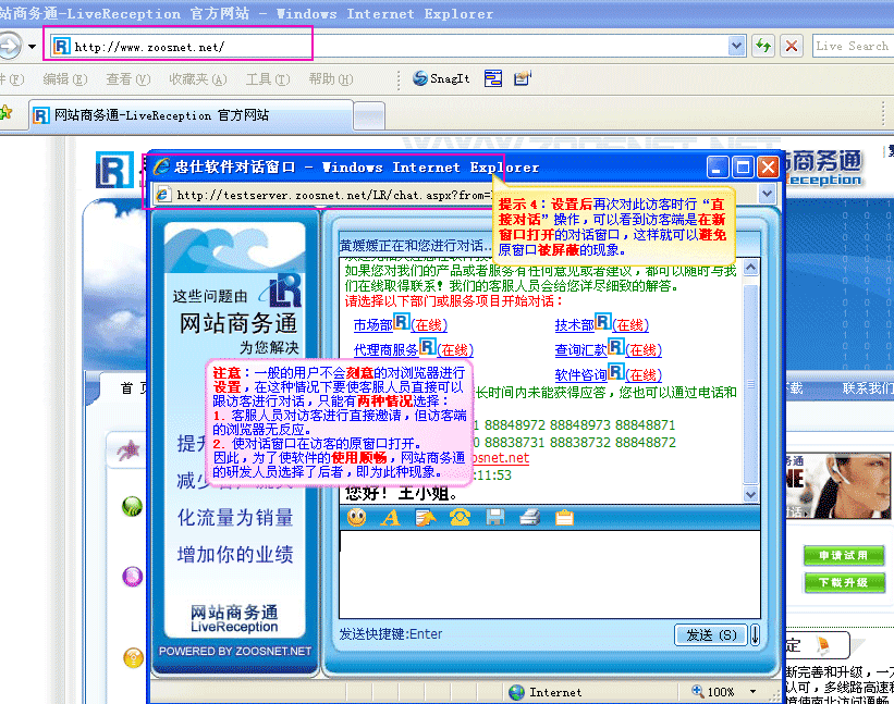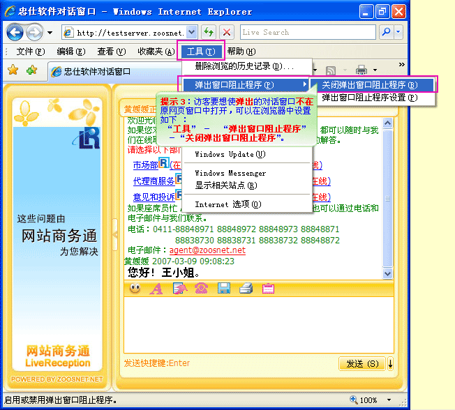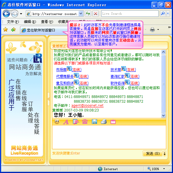 当客服人员对访客进行直接对话后,在访客端会直接在原窗口弹出网站商务通的对话窗口 ,如(图2);