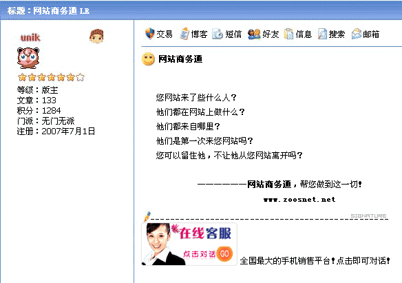 是网站商务通的又一个增值功能。通过网站商务通可以生成2种推广签名:BBS签名和Email签名。