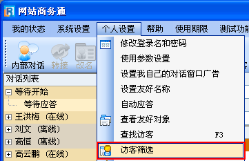 登陆网站商务通软件,选择“个人设置”,将点开的菜单下拉,选择“访客筛选”。如(图1);