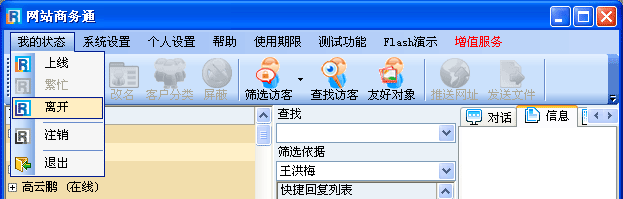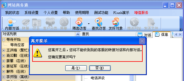 “离开”状态并不是指退出本软件,它是为客服人员可能因为一些事情要暂时离开操作位置时而设定的一种状态形式。