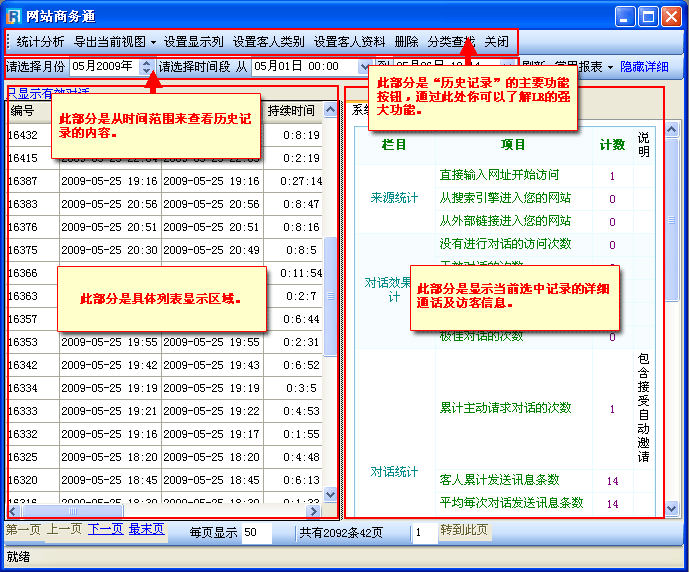 可以查询到所有客服与访客的曾经对话信息,此功能可作为前一阶段对客服人员的工作考核凭证,及业务发展的导向与指导依据。