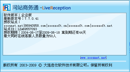 里包括软件版本号、软件开通和截止日期、所绑定的域名、最大同时在线客服人数。