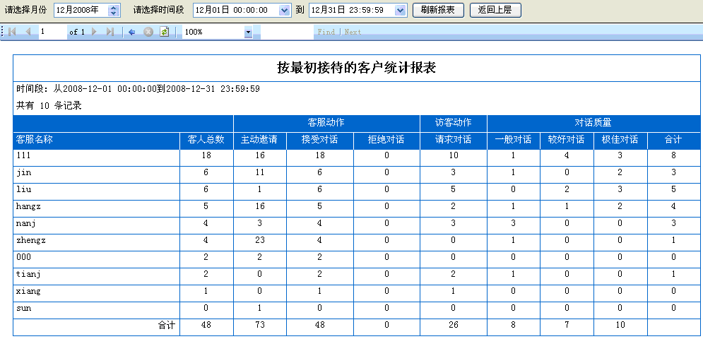 按最初接待的客服统计对话:可以提供第一次接待访客的客服数据统计报表,如(图3);