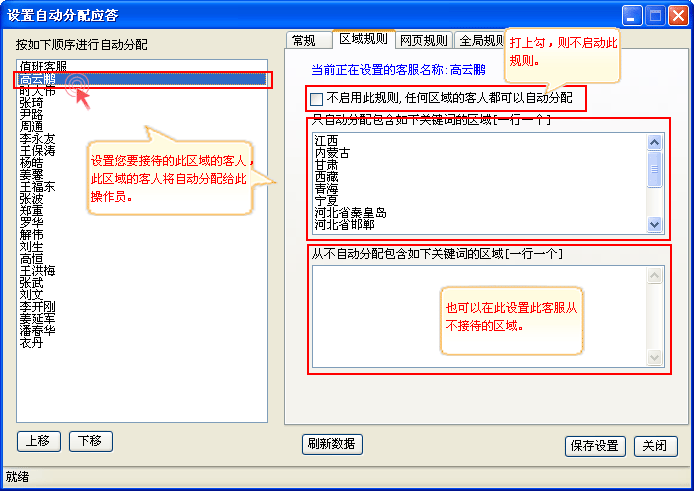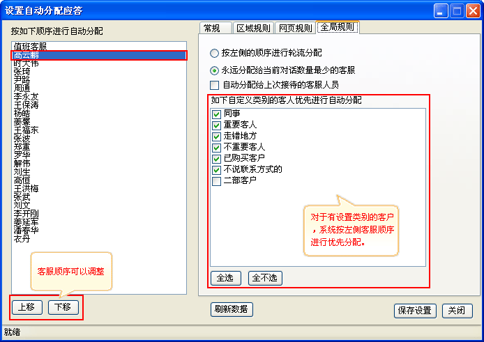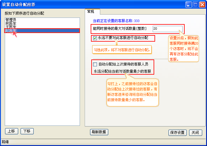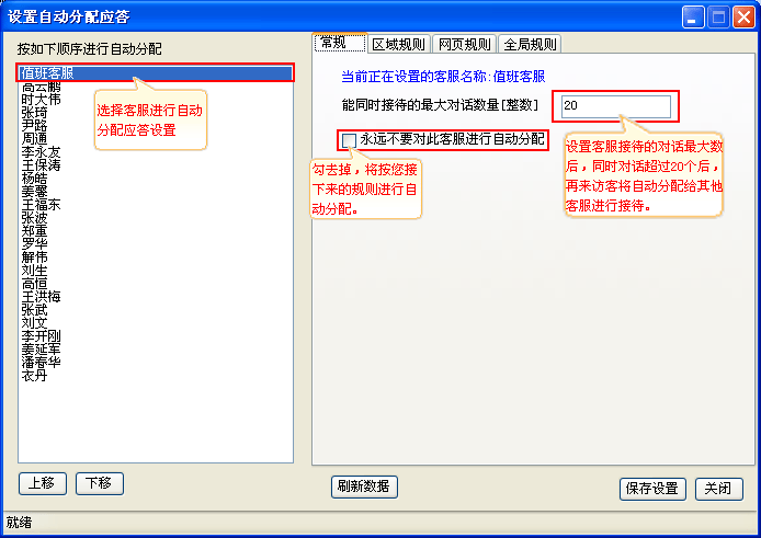 操作说明:系统自动为客服分配咨询访客,不用手动去接待咨询访客,大大提升客服接待效率,根据设定的规则自动分配。 如(图2,图3,图4);