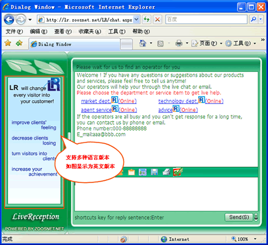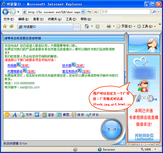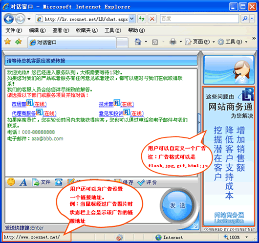 修改:广告设置把企业风采和相关产品介绍,呈现在聊天窗口的显著位置上,每一次聊天,都是企业自我展现的机会。动态广告(flash效果),加强视觉震撼效果,给访客留下更深的印象。