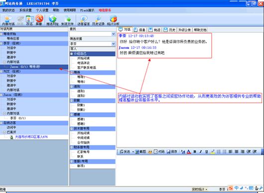 对话客服人员可以通过此功能,可以提高客服人员的接待质量与效率增加内部通讯。