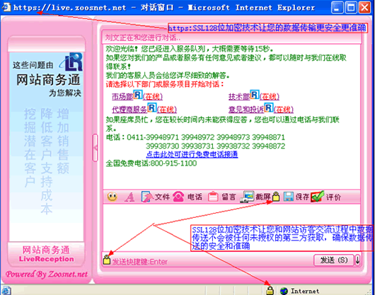 | SSL128 <Security Socket Layer>加密技术让您与网站访客的聊天更安全从而不用担心您的聊天内容被未授权的第三方获取,确保您的数据发送到正确的客户机和服务器,维护数据的完整性,确保数据在传输过程中不被窃取或者改变。 |