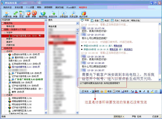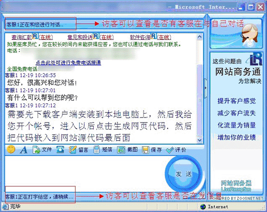 可以双向预知消息,访客通过对话窗口中输入并未发送的内容,客服操作人员可以在网站商务通客服端软件中预先看到。提前预知访客输入时思考和更改的过程,更方便了客服操作人员提前做好应答准备,并且抓住访客的心理状态,提高了客服工作效率,用词准确率以及对话的成功率。