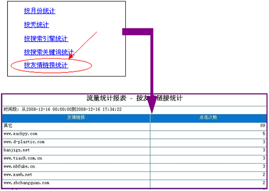 通过友情链接报表统计可以看到您在别的网站上做别的广告的有效点击率是多少,是你衡量广告效果的一个参考方式。