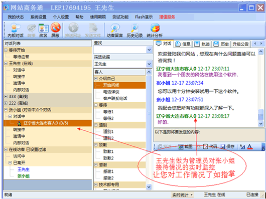 公司的管理人员,可看到下面所有操作人员与访客的对话;