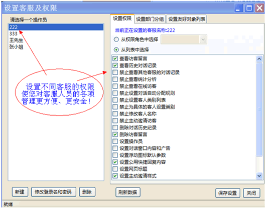 管理员有全部权限,客服接待员只有部分权限,这样您做管理时更方便、数据更安全,有21种不同权限可以选。